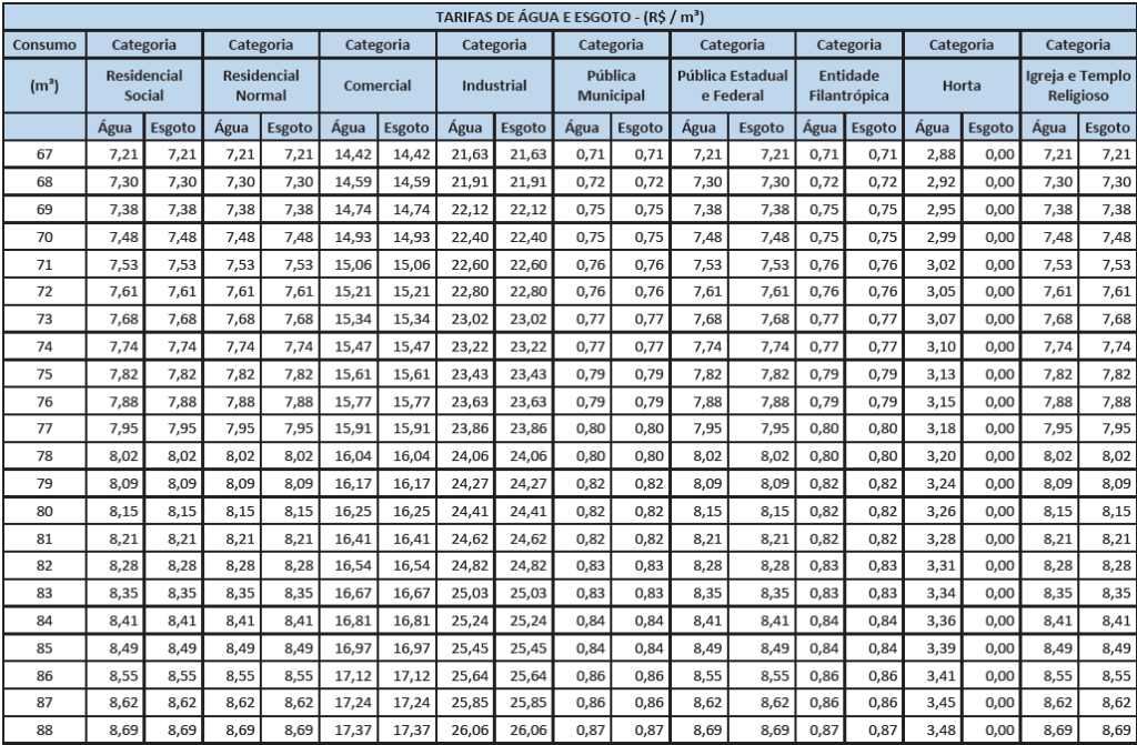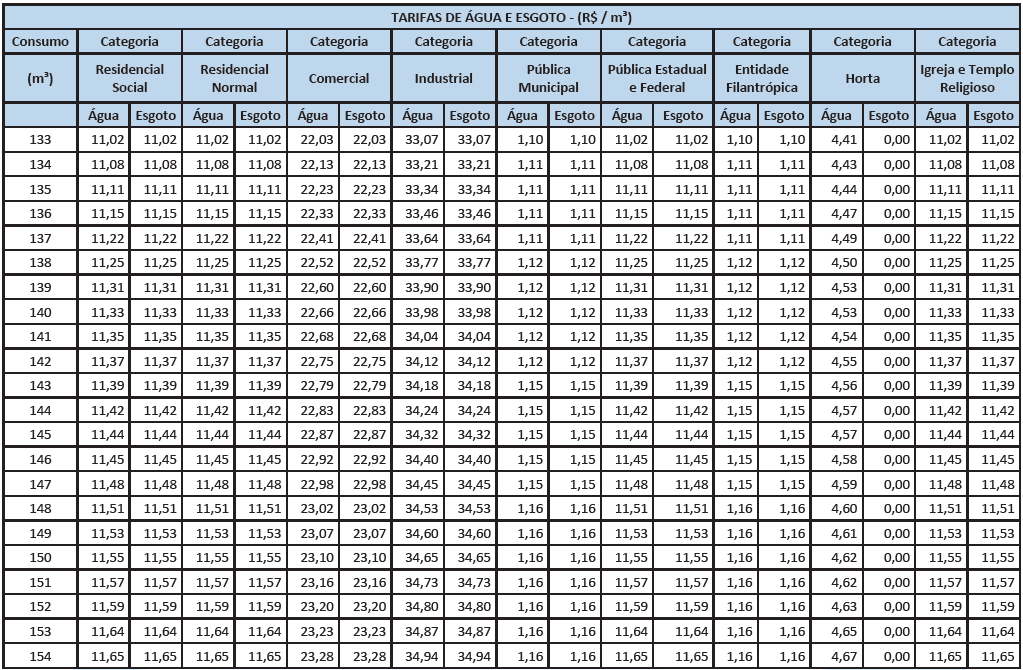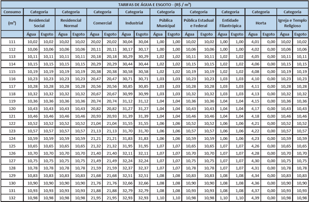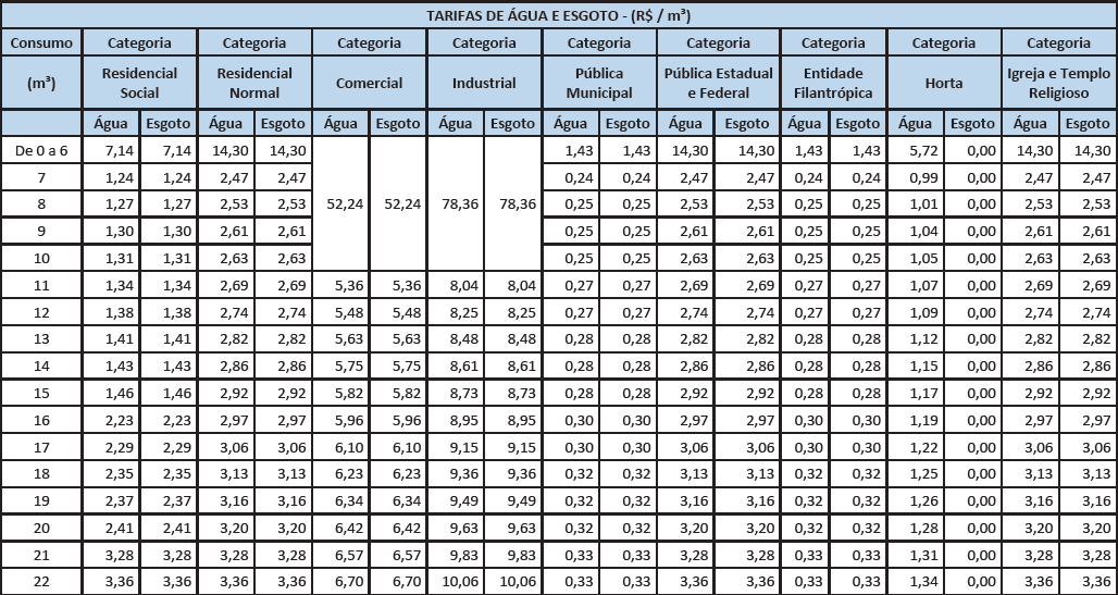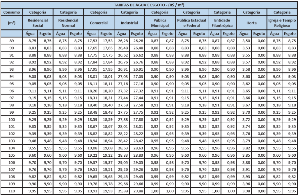 As Tarifas de Esgoto são cobradas em função do volume consumido de água, e seu valor é equivalente a 100% do valor da água, observadas as mesmas categorias.